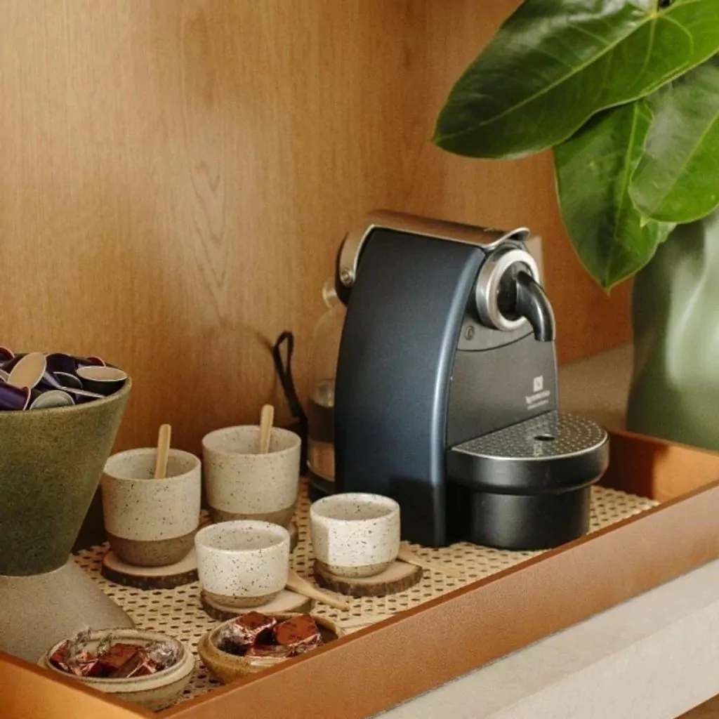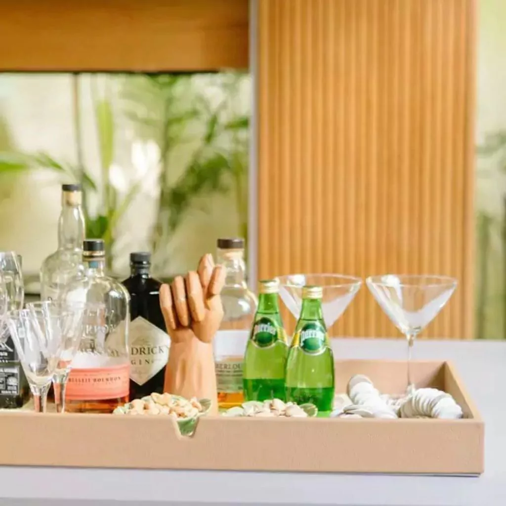 Bandeja em madeira, revestida manualmente em couro natural, com fundo de palha natural. Formato retangular com detalhe em “V”. A bandeja Palhinha garante que as taças, xícaras, máquina de café e acessórios estejam sempre à disposição. Pode ser usada também no bar ou para outra função decorativa.