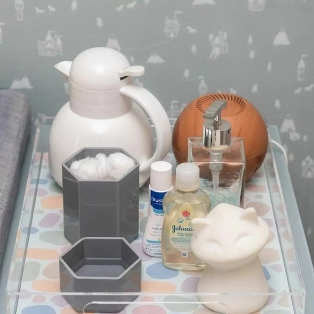 Bandeja retangular com alças, feita em acrílico transparente. Desenvolvida com 8 estampas autorais para casa ou ambiente kids. Funcional e versátil, pode ser usada para deixar na cabeceira da cama, organizar remédios, itens pessoais, acessórios e moringa. No banheiro, use para itens de higiene pessoal e maquiagem. Na cozinha/copa/bar, use para copos e petiscos. No quarto do bebê, use para o kit de higiene como decoração e para lembrançinhas da maternidade.